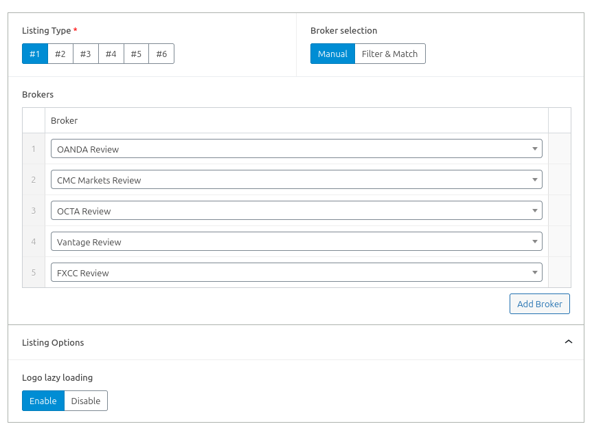 For Broker Listing – Style #1 you only need to choose the brokers, and whether to lazy load broker logos or not. There are no additional options or any other configurations required for this block style.