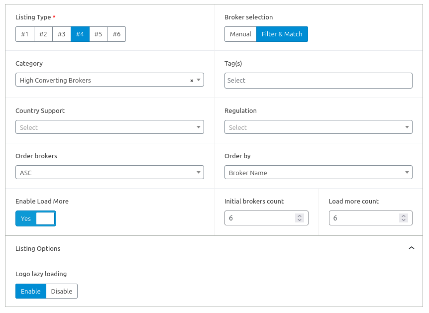 For Broker Listing – Style #4 you only need to choose the brokers and whether or not to lazy load broker logos. There are no additional options or any other configurations required for this block style.