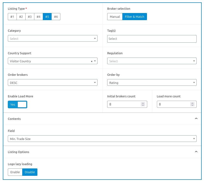 For Broker Listing – Style #5 you need to choose the brokers, whether or not to lazy load broker logos, as well as the field to display the key metric. Fields include min deposit, deposit fees, trading instruments, etc.