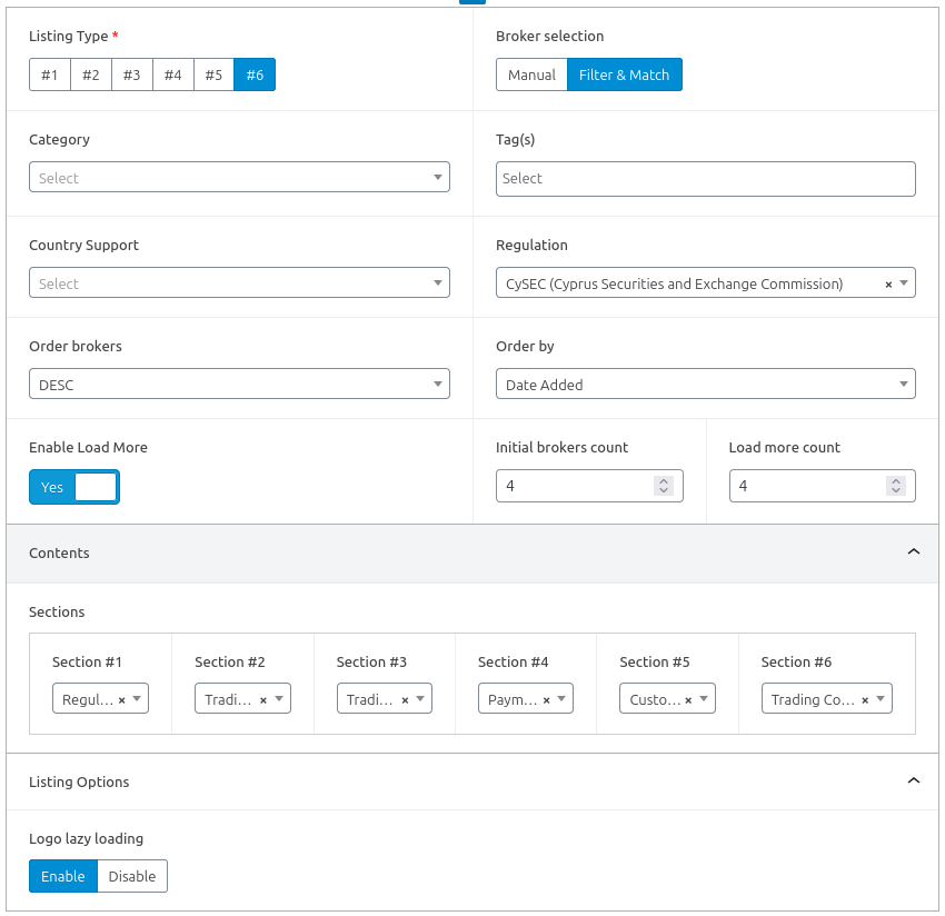 For Broker Listing – Style #6 you need to choose the brokers, whether or not lazy load broker logos, as well as the sections for the block. There are 6 sections available on the block and 6 sections to choose from. You can change their order, or display only some of them if you prefer.